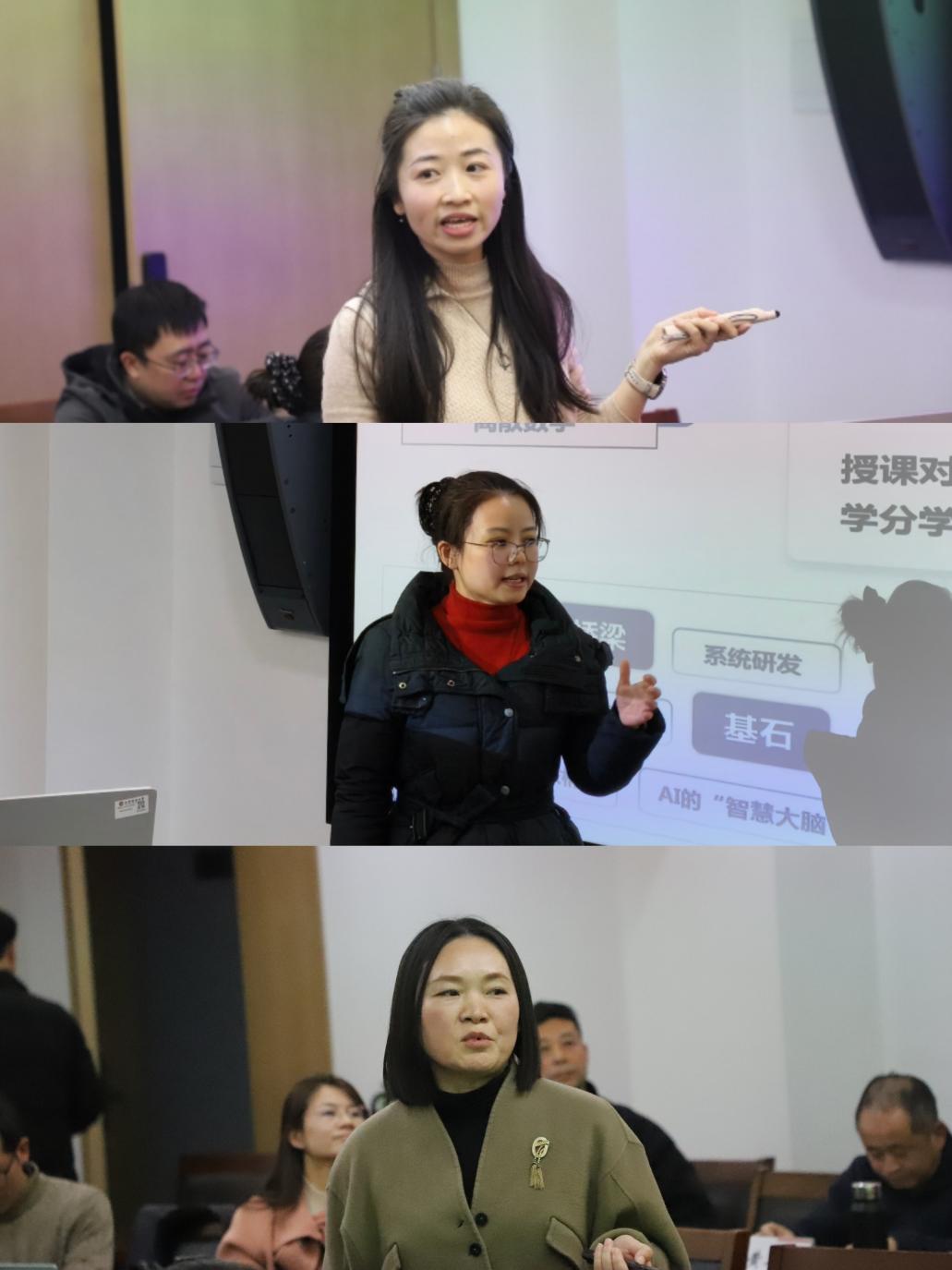 本次活动以“模拟展示+专家点评”的形式展开,旨在通过精准诊断与针对性建议,助力教师优化参赛作品,凝练教学特色。培训会上,校赛复赛不同赛道教师代表依次进行教学创新展示。基础课程赛道黄璆老师以《统计学》课程为例,系统阐释“四通”教学模式,强调思政引领、技术赋能与多元评价的深度融合;人工智能赛道吴洁老师围绕《数据结构与算法》课程,展示AI辅助下知识图谱的构建与分层项目教学体系的实施路径;产教融合赛道汪翠芳老师则基于《产品策划与创意》课程,分享“真项目、真市场、真数据”的产教融合实践机制,体现了教学改革的应用导向。